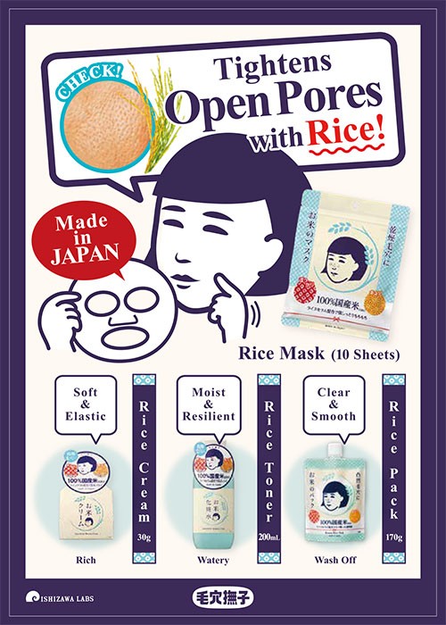 “KEANA NADESHIKO rice skincare” contains 100% Japanese rice-derived skincare serum which acts against the dry porous skin.